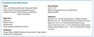 SCG-1 traffic doors are installed in kitchens, restaurants, banquet halls, cafeterias, hospitals and hotels around the world. These very attractive traffic doors offer the classic look and durability associated with stainless steel. With a perimeter seal, the SCG-1 is ideal for use in applications with a temperature differential of 10-30 degrees. They are constructed of a 3/4” sustainable, moisture resistant composite wood core and clad on both sides with tempered aluminum alloy and 48” high stainless steel base plates. Standard scratch-resistant 9” x 14” acrylic vision panels are set in black rubber molding. These doors operate on the Easy Swing Hinge® System pioneered by Eliason more than fifty years ago, and still the smoothest operating and most reliable hinge system on the market today. Custom windows, impact plates, easy spring bumpers and other options are available.
