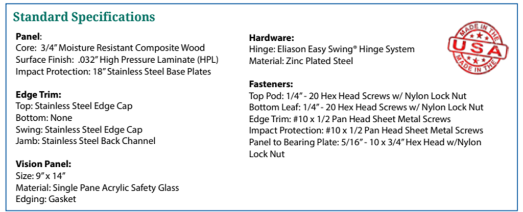 These doors operate on the Easy Swing Hinge System pioneered by Eliason more than fifty years ago, and still the smoothest-operating and most reliable hinge system on the market today. Custom windows, unique laminate designs and impact plate configurations are never a problem at Eliason.